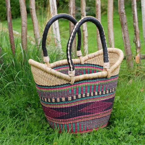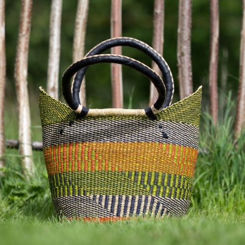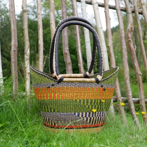 Håndlaget og miljøvennlig kurv av elefantgress. Håndtak av geiteskinn. Flettet av vårt kvinnekooperativ i Ghana.
