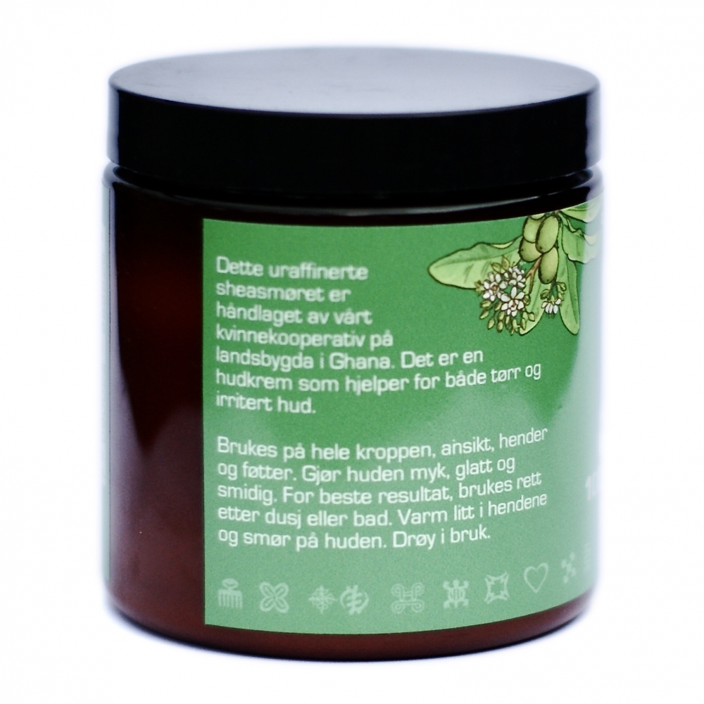 Uraffinert sheasmør tilsatt hampolje og jojobaolje - fet og god og trekker godt inn i huden, for deg som har ekstra tørr hud.